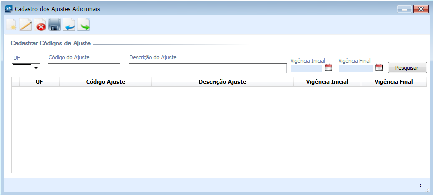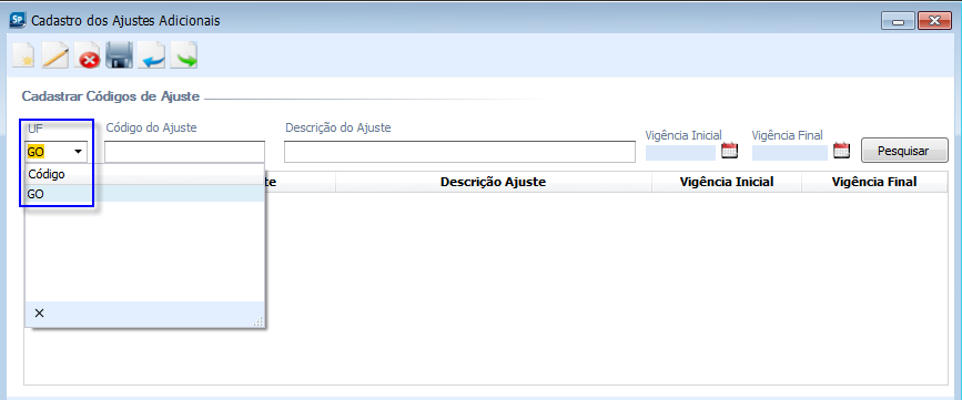e preencher os campos: "UF", "Código de Ajuste", "Descrição do Ajuste" e "Vigência Inicial". O campo "Vigência Final" não é obrigatório.