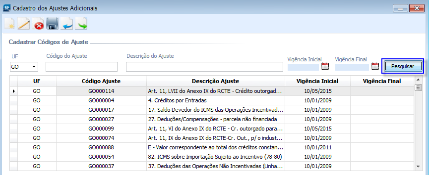 Foi desenvolvida também a tela “Cadastros dos Ajustes de Créditos Fiscais” com a finalidade de permitir a atualização do cadastro de código de ajustes, cujo quarto caractere seja igual a “9”, conforme a Tabela 5.1.1 - Tabela de Códigos de Ajustes da Apuração do ICMS.