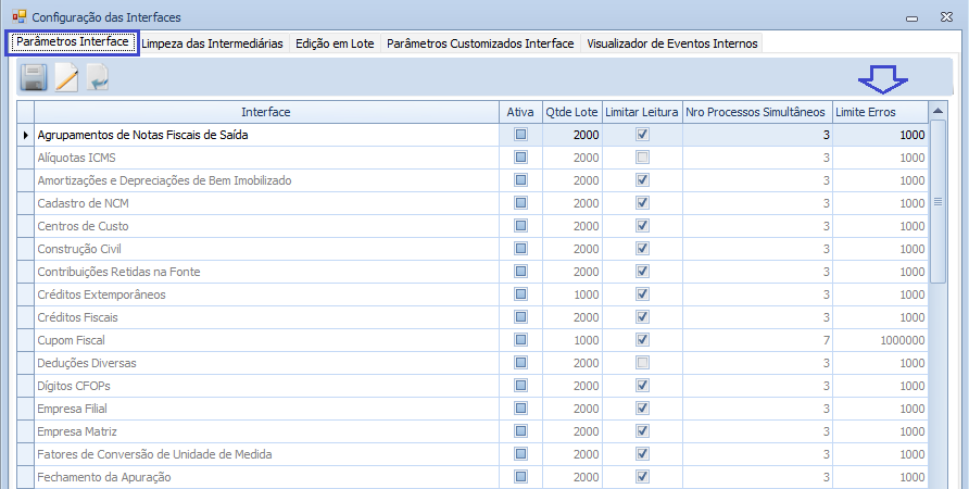 1. Tratamento para o processo de Interface, preenchendo o limite de erro nas tabelas de parâmetros de interface com valor defaut 1000, para todas as interfaces que estiverem com valor nulo ou igual a zero.