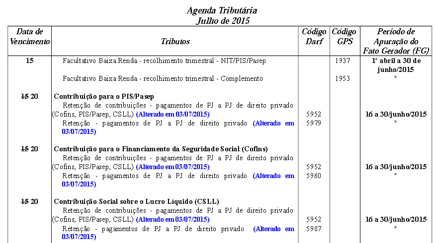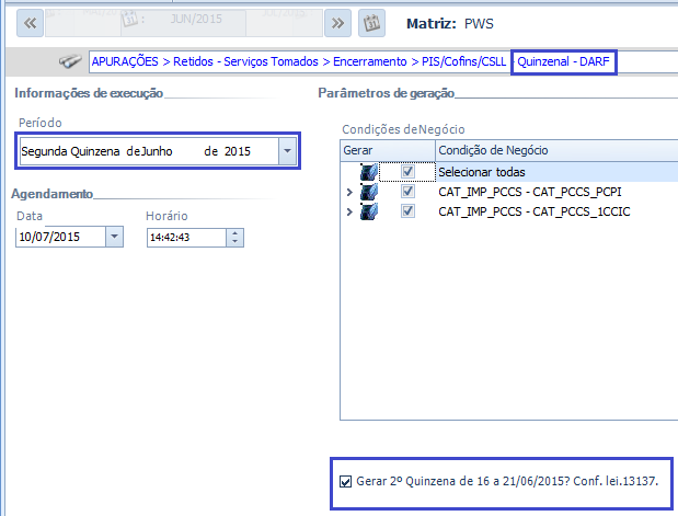- As Obrigações do PIS/COFINS/CSLL Quinzenal foram tratadas para considerar a vigência final até 30/06/2015.