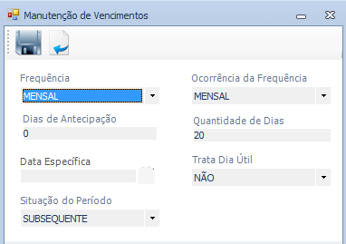 Para as apurações do PIS/COFINS/CSLL Mensais, criar novo Tipo de Vencimento, para vencer no último dia útil do 2º decêndio do mês subsequente, conforme abaixo: