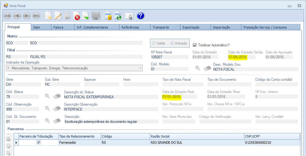 Data Entrada Real: 01/01/2016 (data em que o usuário deveria ter escriturado a nota)