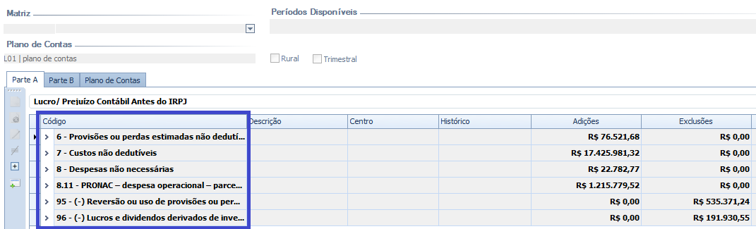 Melhoria efetuada na tela do LALUR - LACS para apresentar o código da tabela dinâmica na descrição das linhas da parte A das demonstrações: