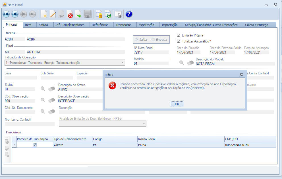 Descrição da Nota: Tratamento realizado para salvar as informações editadas na Aba Exportação da Tela Nota Fiscal, quando o período está encerrado.
