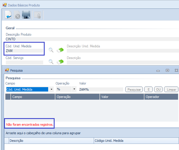 Ao tentar utilizar a Unidade de Medida que consta como Inativa, aparecerá a seguinte mensagem (Não foram encontrados registros).