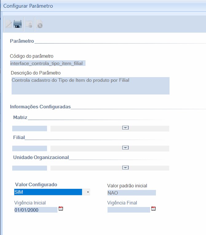O cadastro por filial pelo processo de interface depende de configuração do parâmetro ‘interface_controla_tipo_item_filial’ com valor ‘SIM’, conforme imagem abaixo, caso contrario, a interface apenas ira permitir um tipo por produto. Caso o parâmetro não esteja configurado e seja informado um tipo diferente do cadastrado será utilizado o tipo que estiver no cadastrato.