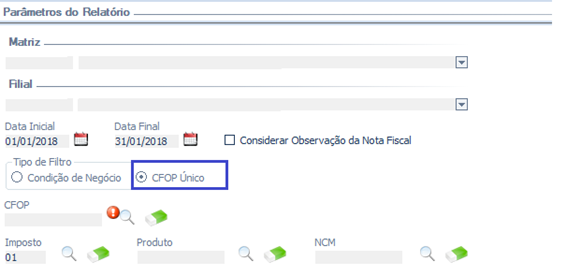 Quando selecionado o Tipo de Filtro “CFOP Único” será obrigatório o preenchimento de um CFOP para geração do relatório.