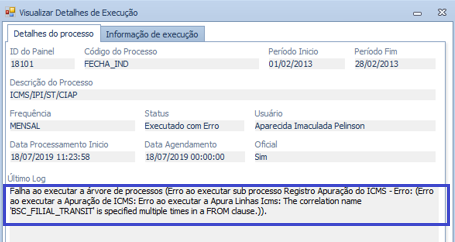 Falha ao executar a árvore de processos (Erro ao executar sub processo Registro Apuração do ICMS - Erro: (Erro ao executar a Apuração de ICMS: Erro ao executar a Apura Linhas Icms: The correlation name 'BSC_FILIAL_TRANSIT' is specified multiple times in a FROM clause.)).