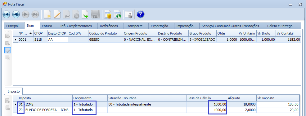 Para efetuar a soma do imposto principal ao FECP, os Tipos de Lançamento e Base de Cálculo de ambos os impostos devem ser iguais.