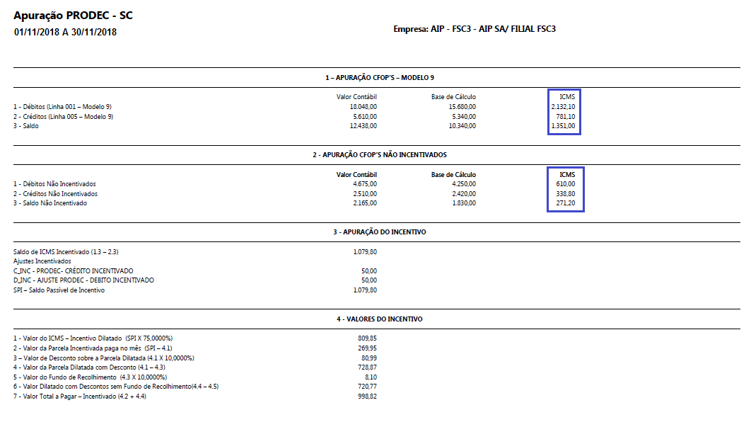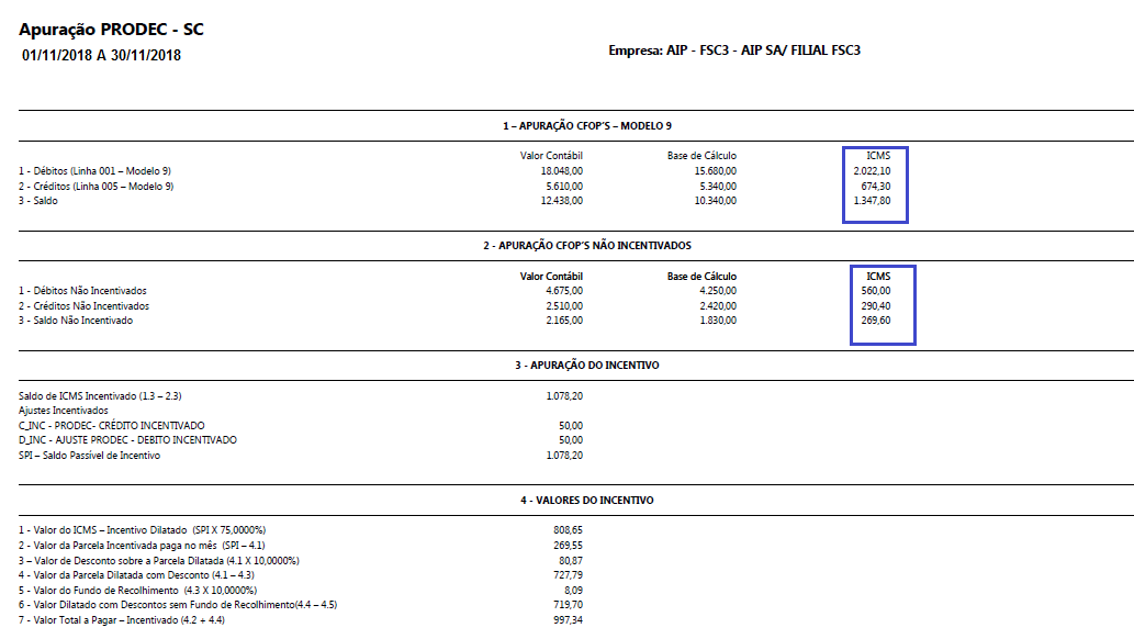 Foi efetuado tratamento no Processo de Apoio PRODEC - SC, para somar os impostos 01-ICMS e 70-FECP sobre ICMS destacado na nota fiscal, em atendimento ao Ato Cotepe 44/2018, que instituiu o Guia Prático EFD ICMS/IPI versão 3.0, que dispõe que o valor do FECP deve ser somado ao imposto principal.