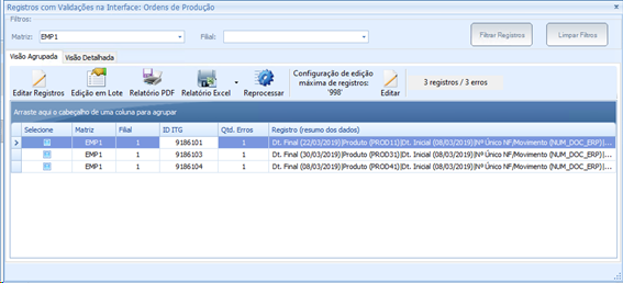 Componente Tela de validações na Interface: Implementação da não obrigatoriedade de preenchimento do filtro de Filial, na tela de edição de registros com erros de validação, conforme demonstrado no print a seguir: