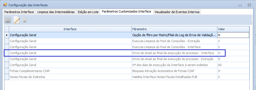 Foi implementada a opção de envio de e-mail ao final da execução dos processos de Interface. Essa opção é parametrizada na tela de Configuração das Interfaces e já vem com o valor default marcado como “N” (Não enviar e-mail), conforme demonstra o print abaixo: