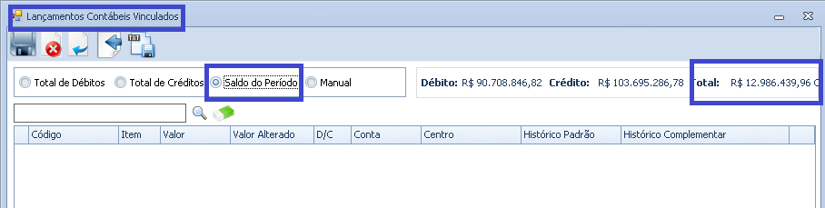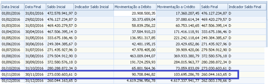 Para utilizar o saldo do mês, permanece a funcionalidade já existente: acessar a tela de lançamentos vinculados e clicar na opção "Saldo do período". No caso do exemplo acima, o saldo demonstrado nesse caso será apenas o valor da movimentação do mês de Novembro: