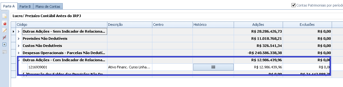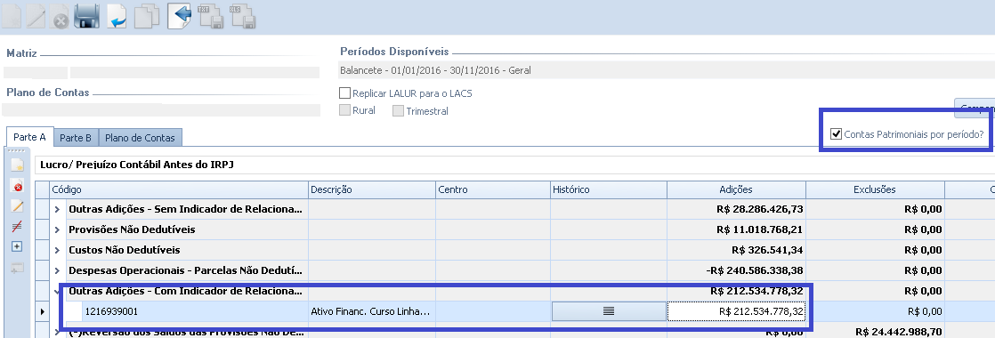 Ex.: Criação de demonstração para um período de Janeiro a Novembro > Ao utilizar uma conta patrimonial na parte A do LALUR/LACS (Adições, Exclusões e compensações) e selecionar o flag de Contas Patrimoniais por período, o saldo da conta patrimonial será o total das movimentações de 01/01/xx a 30/11/xx (data da demonstração criada).