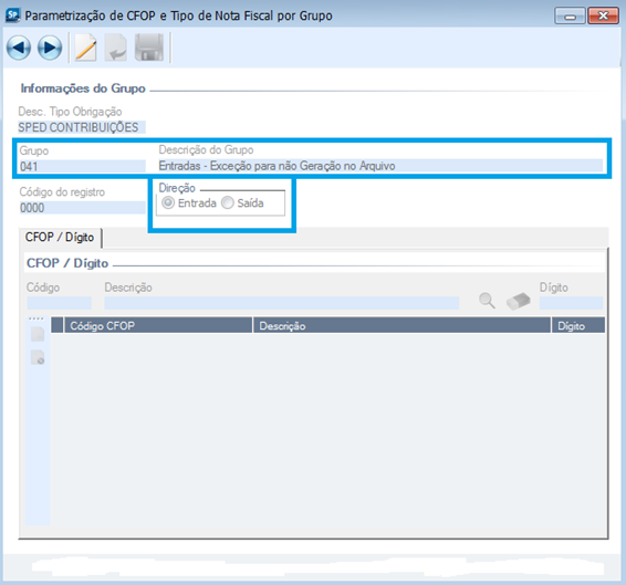 Menu: Obrigações > Configurações Compartilhadas > Parametrizações por Grupo > CFOP e Tipo de Nota Fiscal