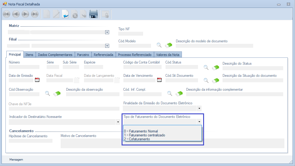 Na tela “Nota Fiscal Detalhada”, na aba Principal, foi incluído o novo campo Tipo de faturamento do documento eletrônico, que aceita os seguintes valores:
