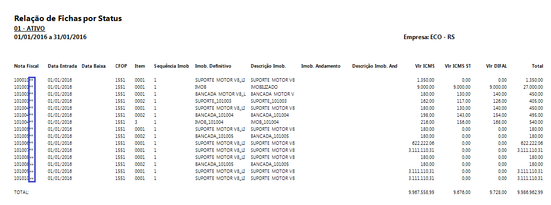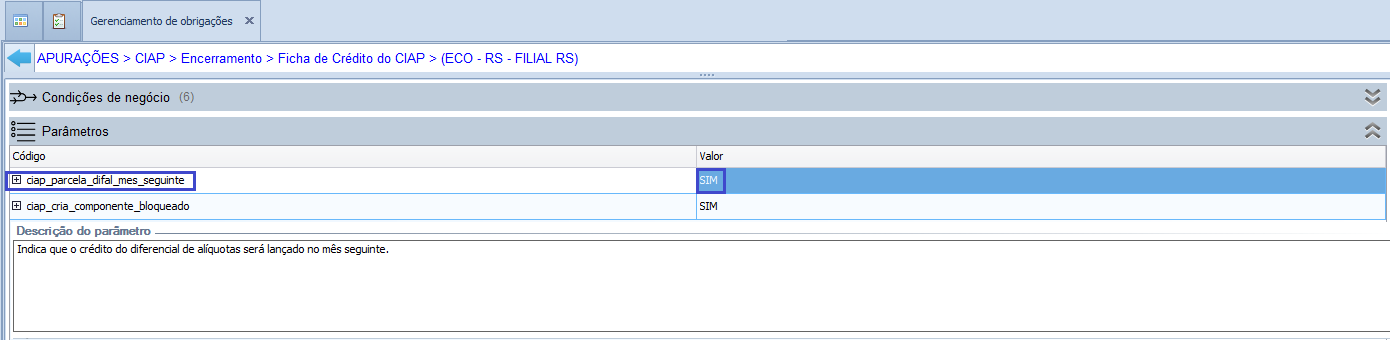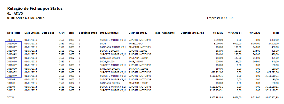 O relatório apresenta ** (asterisco) após o número das notas fiscais, para informar que as mesmas têm o DIFAL deslocado para o mês seguinte, com base no parâmetro “ciap_parcela_difal_mes_seguinte”.