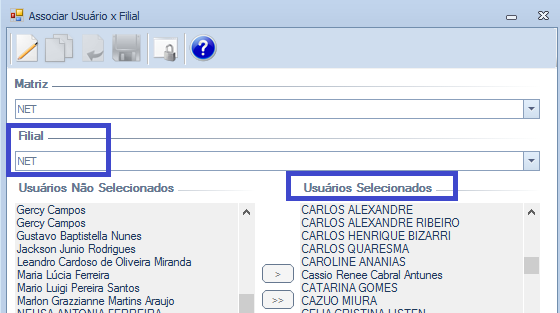 Para verificar os acessos, é necessário que o usuário esteja com o nome na coluna Usuários Selecionados da tela Associar Usuário X Filial.