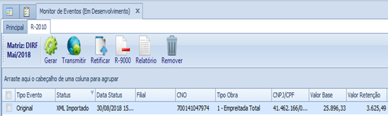 Descrição da Nota: EFD-REINF-Melhorias no Monitor referentes a Importação do XML, inclusão de controle de acessos, Certificado Digital para informar o Procurador Eletrônico e tratamentos efetuados no evento R-2010.