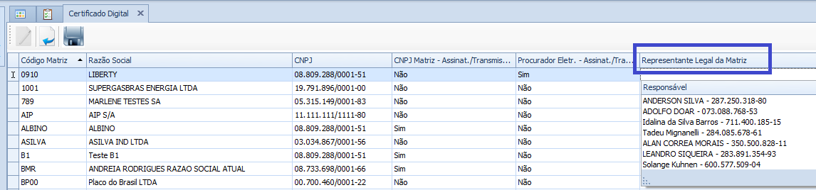 Melhoria efetuada na tela de Certificado Digital para apresentar todos os tipos de representantes legais, somente os vigentes, cadastrados na Matriz, incluindo o responsável com CNPJ. Pois estava apresentando somente os responsáveis com CPF.