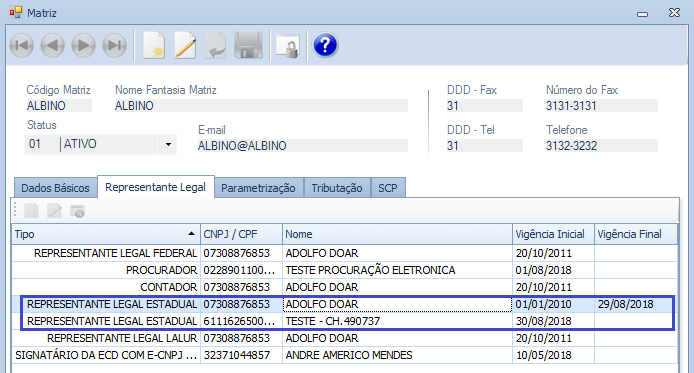 Tratamento efetuado para demonstrar somente os dados da Matriz do endereço vigente, pois estava apresentando os dados de todos os endereços.
