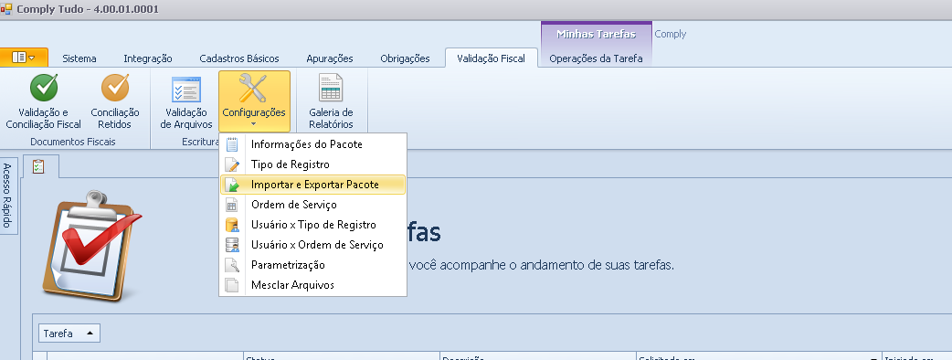 Após Logar no Comply > Aba Validação Fiscal > Importar e Exportar Pacote