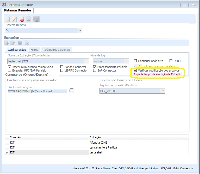 Essa tela é a responsável pela parametrização da funcionalidade de verificação da codificação do arquivo txt. A opção está destacada abaixo, frisando que essa verificação pode impactar a performance da execução de uma Extração de Dados relacionada à tal Sistema Remoto: