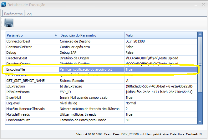 Para sabermos como identificar se uma execução da Extração de Dados considerou ou não a opção de verificação da codificação dos arquivos txts, basta verificar os parâmetros da execução da Extração de Dados, conforme o print a seguir: