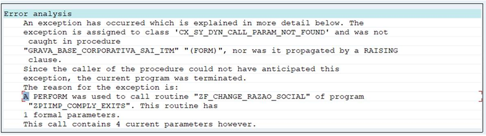 Durante a execução dos Extratores de Indiretos, ocorria um DUMP ao chamar o ponto de Exit ZYLFSATI041 que foi criado de forma errada, causando o DUMP CX_SY_DYN_CALL_PARAM_NOT_FOUND, isto por que os nomes dos pontos são até 10 posições e o ponto criado tinha 11 posições. Logo, gerava conflito com o ponto ZYLFSATI04.