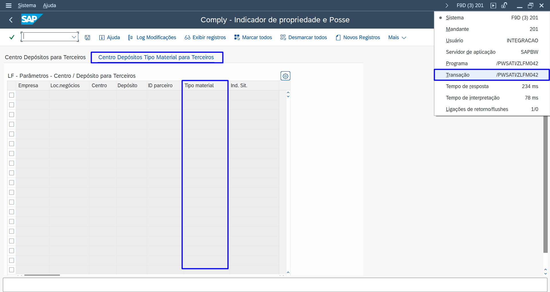 Então, criamos na transação /N/PWSATI/ZLFM042 uma nova aba Centro Depósitos Tipo Material para Terceiros com opção de parametrizar o Tipo de material: