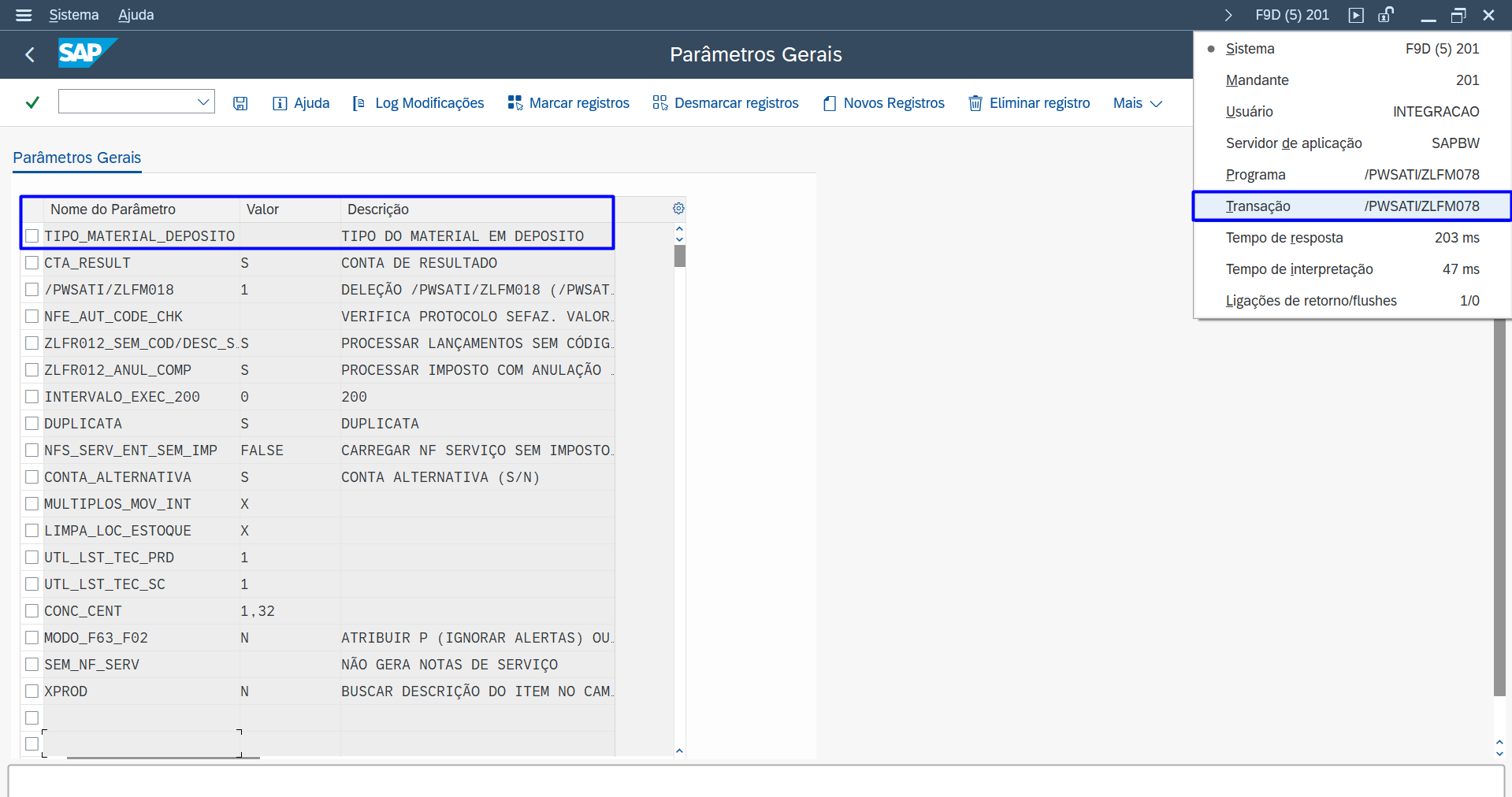 Salientamos que se desejável utilizar a nova aba Centro Depósitos Tipo Material para Terceiros, é necessário adicionar o parâmetro TIPO_MATERIAL_DEPOSITO na transação de Parâmetros Gerais dos Extratores.