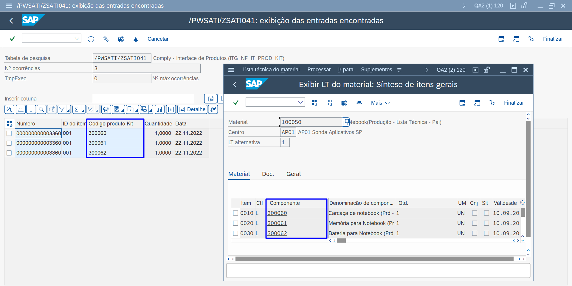 Na Nota 014756 liberamos a extração dos produtos, que são KITs, porém a lógica das transações /PWSATI/ZLFR000 e /PWSATI/ZLFR300 continha informações errôneas, na qual, era informado o campo de código do produto errado, porque buscávamos o campo OJTXP da estrutura STPOX.