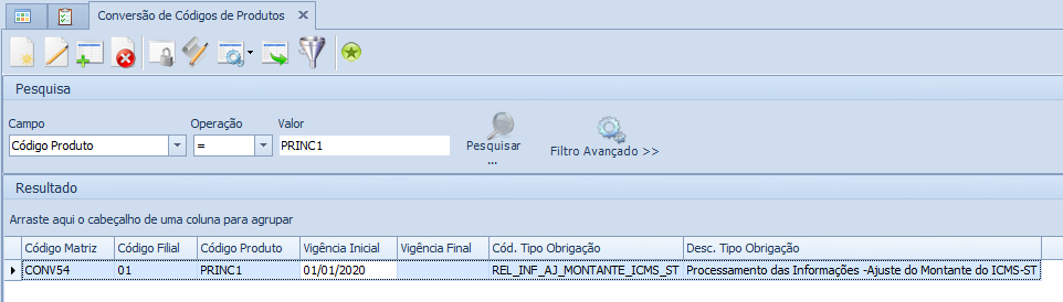 No retorno da consulta serão exibidas as seguintes informações: Código Matriz, Código Filial, Código Produto, Vigência Inicial, Vigência Final, Cód. Tipo Obrigação e Desc. Tipo Obrigação.