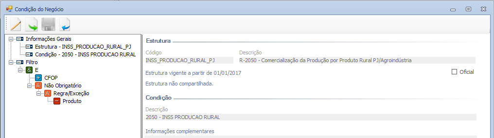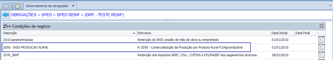 Para o evento R-2050 deverá ser criada a condição de negócio para a estrutura INSS_PRODUCAO_RURAL_PJ.