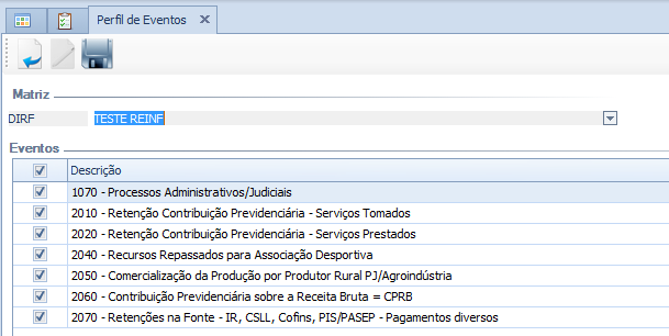 Menu: Obrigações > SPED > EFD REINF > Perfil de Eventos