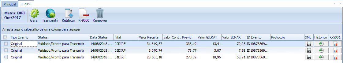 Ao clicar no botão Gerar é gerado um evento R-2050 para cada Filial.