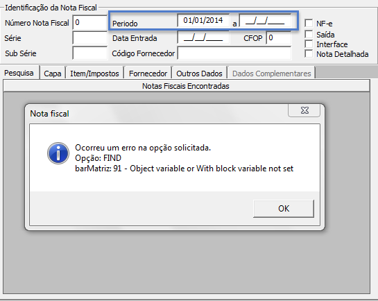 Ao efetuar pesquisa de Notas fiscal por Período sem preencher a data final, estava apresentando mensagem de variável inválida, conforme abaixo: