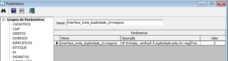 - Em nome localizar o parâmetro “interface_trata_duplicidade_chvnegocio”