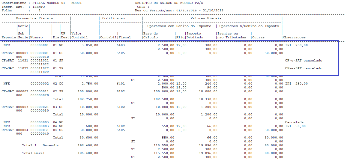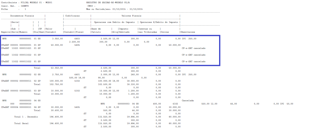 Foi efetuado tratamento para considerar as informações do Cupom Fiscal Eletronico (Modelo 59), alinhados com as demais notas fiscais apresentadas no livro.