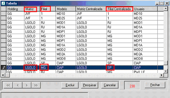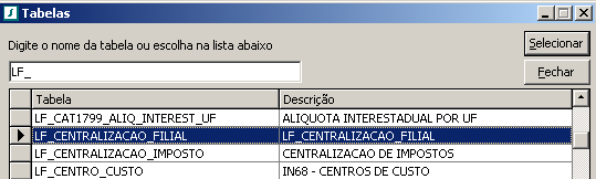 Menu Gerência à> Tabelas à> Manutenção à> LF_CENTRALIZACAO_FILIAL