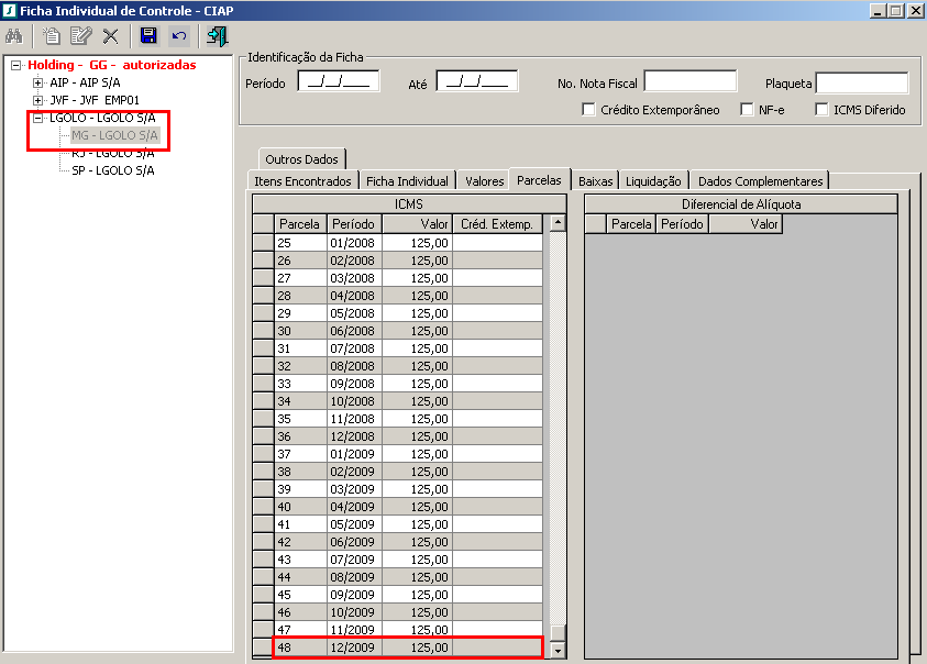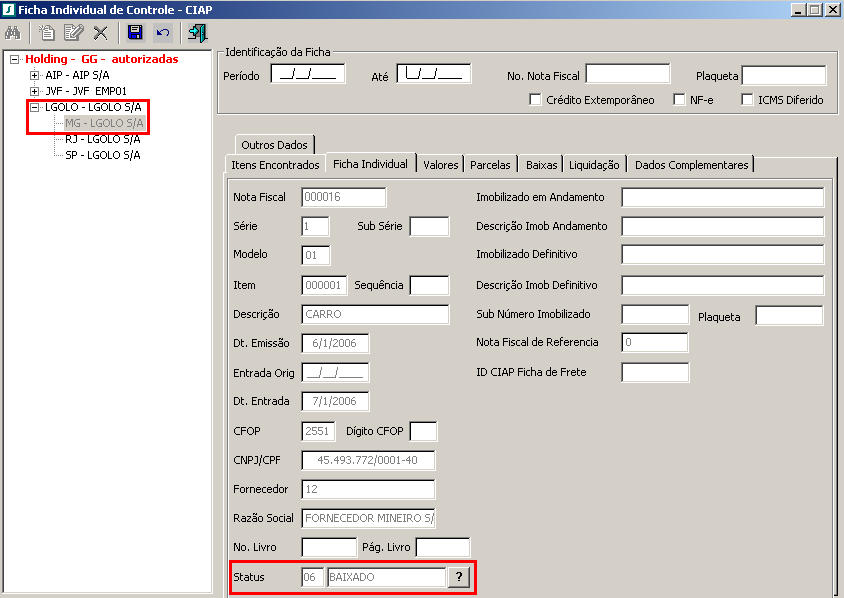 Fichas: O status aparece como baixado (06) na parcela 48 de ambas as filiais.