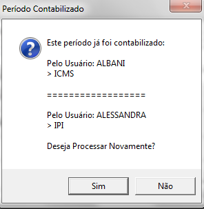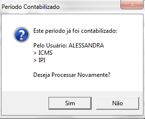 Caso o período selecionado já tenha sido gerado, será apresentada a seguinte mensagem em tela: Esse período já foi contabilizado pelo usuário XXXXXXX, > Opções Contabilizadas (ICMS / IPI. Deseja Processar novamente?
