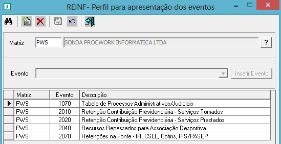 Para atribuir os Eventos Periódicos necessários para os cenários de cada empresa, acessar: Obrigações > Obrigações > Federais > REINF > Perfil para apresentação dos Eventos.