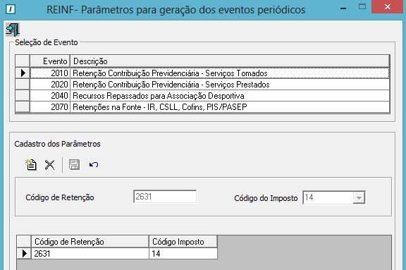 Para cadastrar os códigos de Impostos e as respectivas Retenções necessárias para geração dos eventos, acessar: Obrigações > Obrigações > Federais > REINF > Parâmetros para geração dos eventos periódicos