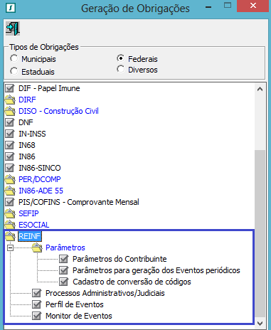 Para geração da Obrigação REINF, acessar: Obrigações > Obrigações > Federais > REINF