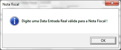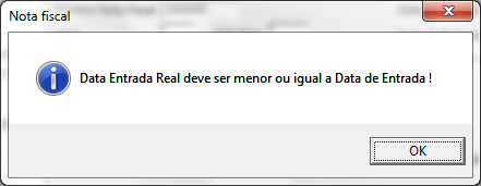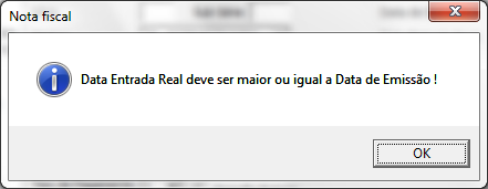 O campo Data Entrada Real deve ser maior ou igual a Data de Emissão, caso contrário será apresentada a seguinte mensagem: