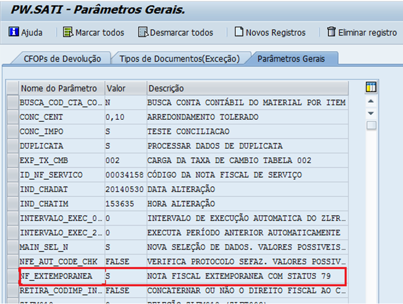 Este processo será realizado se a nova parametrização, 'NF_EXTEMPORANEA', estiver com valor ‘S’ na Transação ZLFRM078 (Parâmetros Gerais), conforme abaixo: