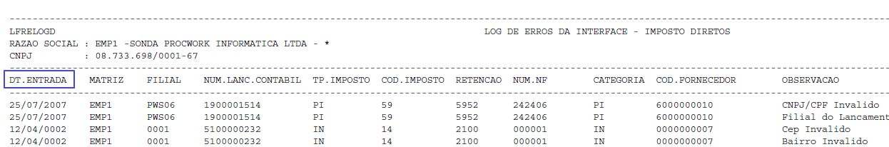O campo Data de Entrada está disponível no relatório Log de Erros da Interface – Imposto Diretos.
