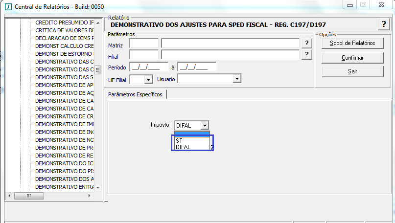 Descrição da Nota: DEMONSTRATIVO DOS AJUSTES DO SPED FISCAL - REGISTRO C197/D197 (SATI0522) - Tratamento efetuado para corrigir regra no relatório, que não considerava a seleção dos filtros ST e DIFAL. Listava indevidamente dados de ambos os filtros.