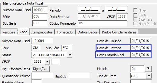 Para que a ficha seja criada, e sejam geradas as parcelas extemporâneas, no sistema de origem (ERP) deve ser utilizado o status 79 – Extemporâneo, indicando no campo Data de Entrada, a data em que o usuário está efetuando o lançamento da nota fiscal, e no campo Data Entrada Real, o período em que a nota fiscal deveria ter sido lançada, exemplo:
